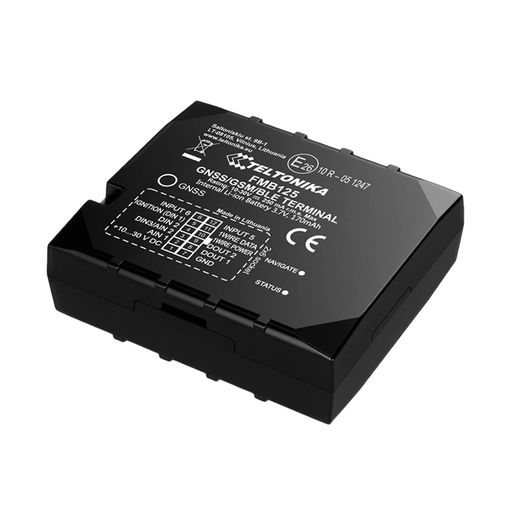 FMB125 оснащён Bluetooth и резервным аккумулятором. FMB125 предназначен для работы с различными устройствами по интерфейсам RS232 и RS485, например, цифровые датчики топлива (LLS), навигационное устройства Garmin, считыватели RFID и т. д.