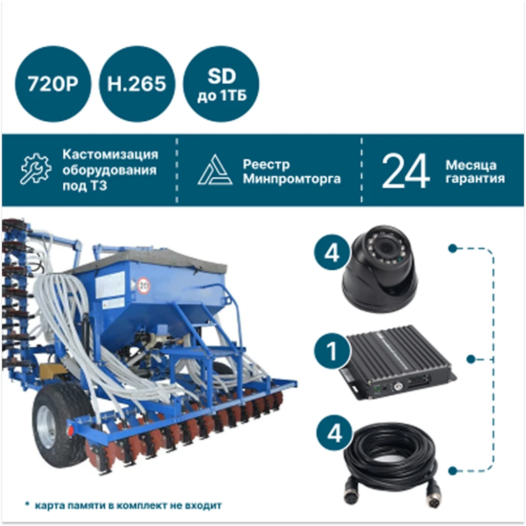 Комплект видеонаблюдения NSCAR AE401_SD предназначен для установки на различные виды сельхозтехники, включая тракторы, комбайны, сеялки, опрыскиватели и прицепы. Система обеспечивает надежный контроль рабочих процессов и безопасности 1.